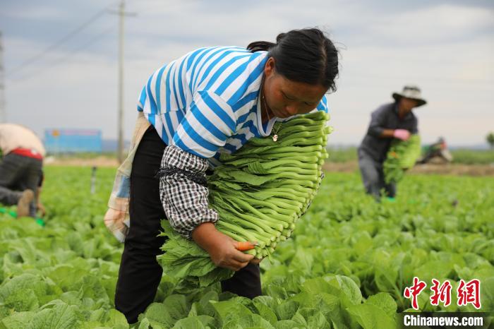 寧夏固原原州區(qū)冷涼蔬菜種植基地內(nèi),農(nóng)戶采摘菜心。 固原市委宣傳部供圖