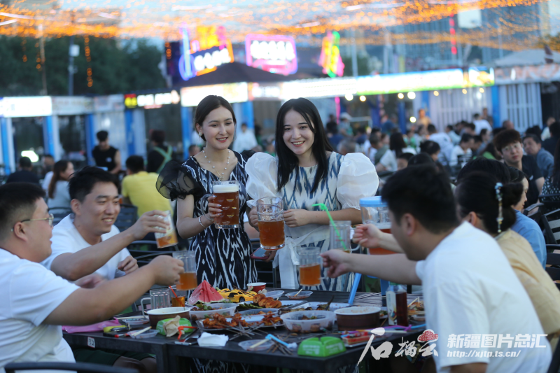 6月18日,市民在烏魯木齊華凌夜市品嘗美食。 石榴云/新疆日?qǐng)?bào)記者 李雄心攝