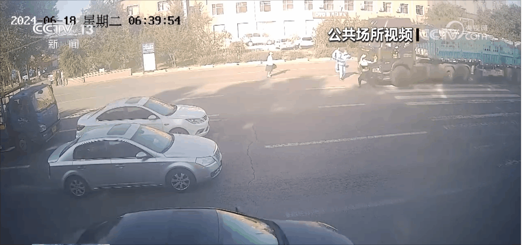 視頻顯示,6月18日早上6點40分左右,輔警陳作兵在長春市第一O六中學(xué)校門前執(zhí)勤。突然,一輛大貨車從遠(yuǎn)處駛來,不斷鳴笛。眼看就要經(jīng)過斑馬線卻沒有及時減速,此時學(xué)生和家長正要過馬路。陳作兵看到后,立即截停車輛,貨車剎車后由于慣性將他撞得連連后退。