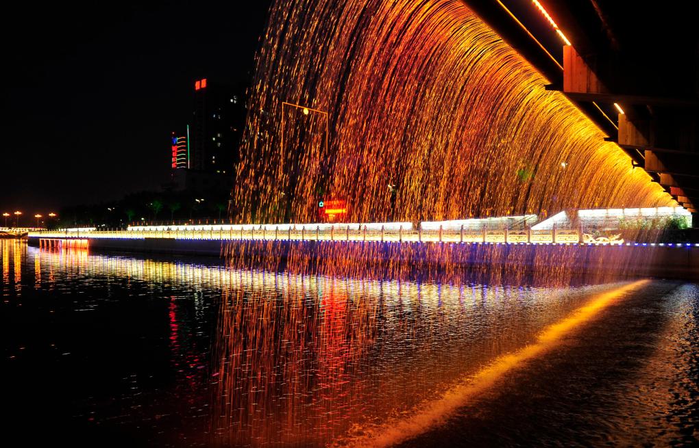 2014年6月22日,我正在河北滄州采訪,準備吃晚飯時,突然看到手機上顯示大運河申遺成功的消息?;氐劫e館,我拿上相機就飛奔出去,來到清風樓下的大運河景觀帶,記錄下了大運河夜色。