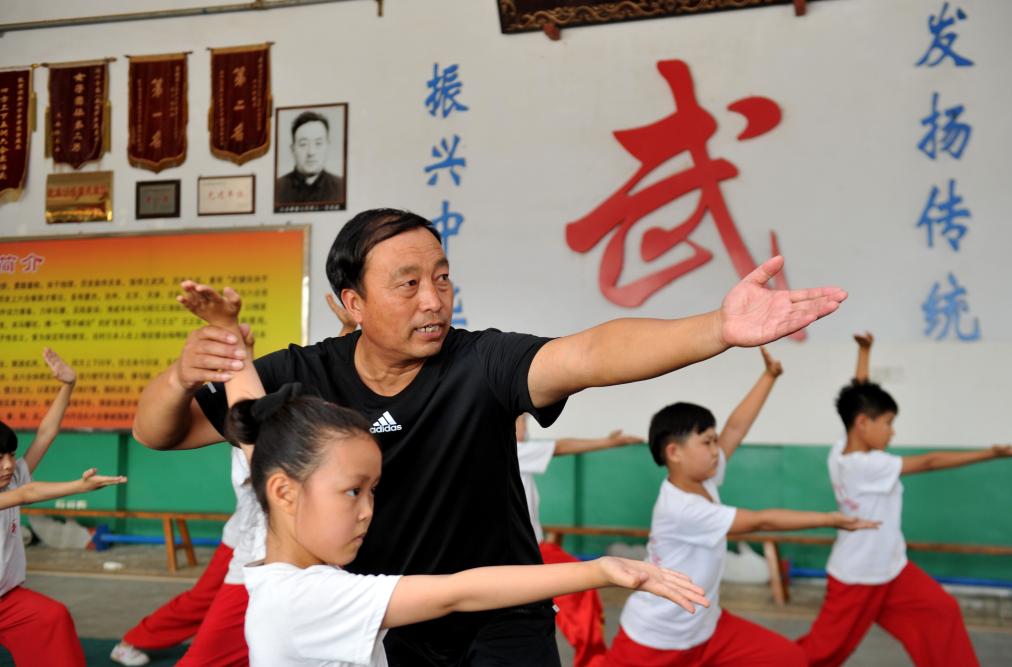 2017年6月17日,石同鼎(中)在泊頭六合武館內(nèi)教授小學生六合拳法。
