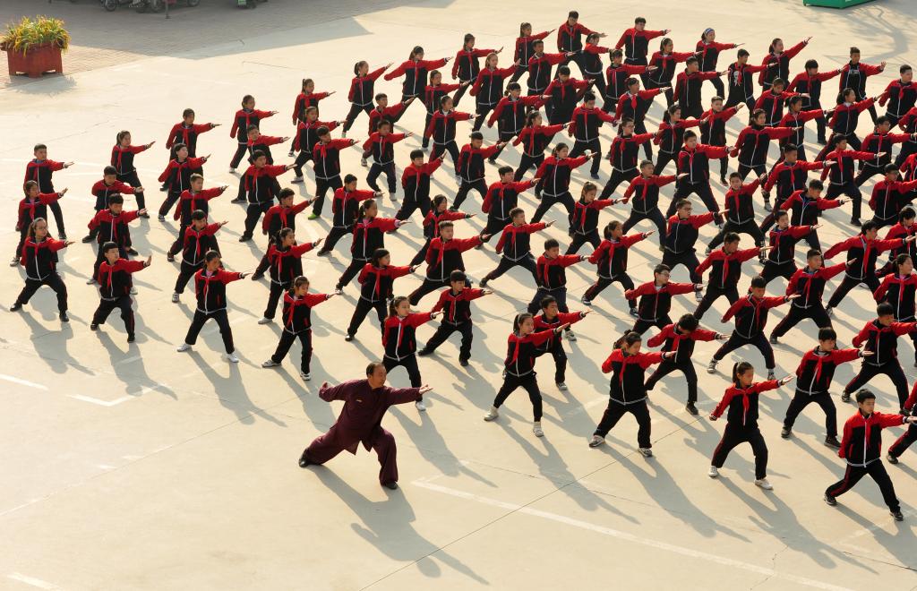 2017年12月8日,泊頭市東方小學學生在六合拳傳承人石同鼎的指導下學習六合拳器械。