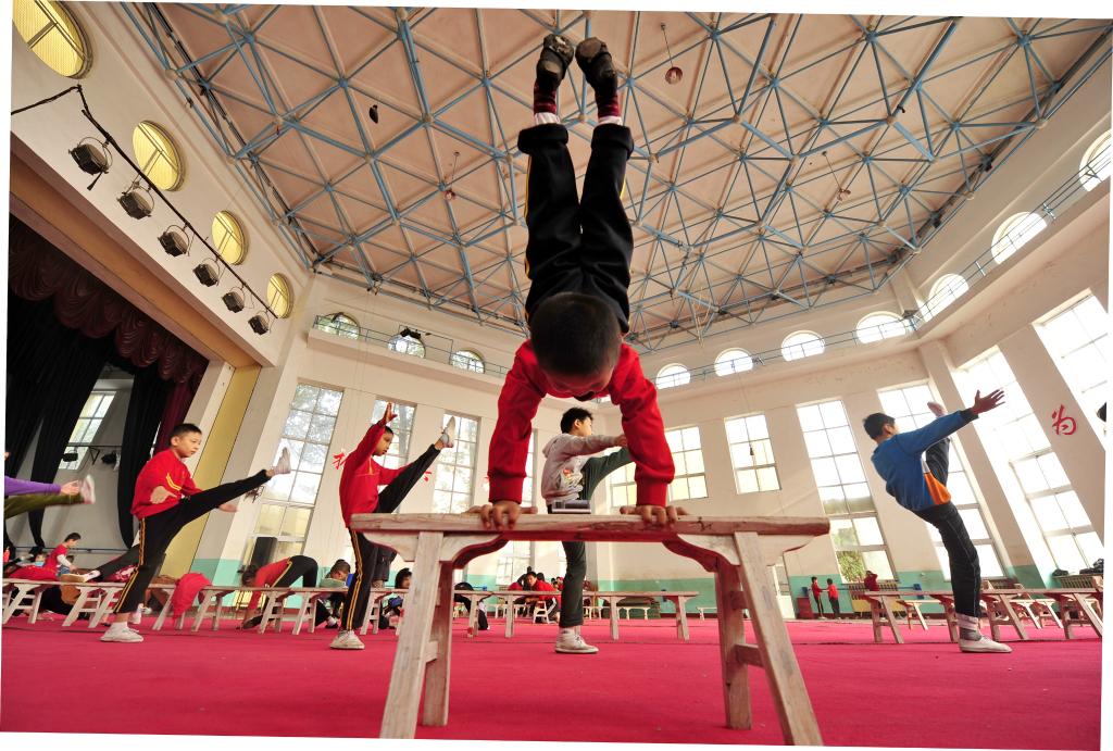 2014年10月24日,吳橋國際雜技藝術(shù)學校的學生們在練功。