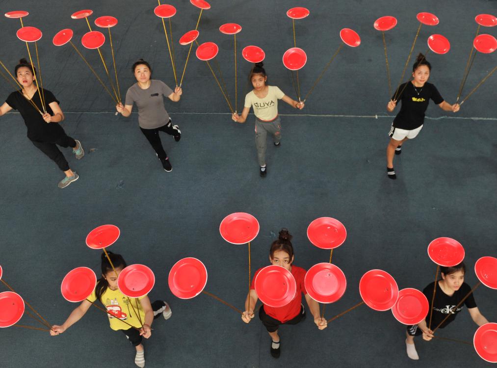 2018年7月30日,來自老撾的留學生們在吳橋雜技藝術(shù)學校內(nèi)練習轉(zhuǎn)碟。