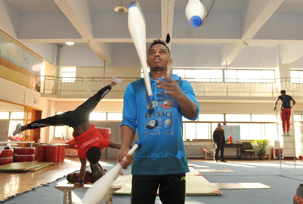 2018年1月25日,在吳橋雜技藝術(shù)學校,來自埃塞俄比亞的留學生依布薩(中)在練習雜技。