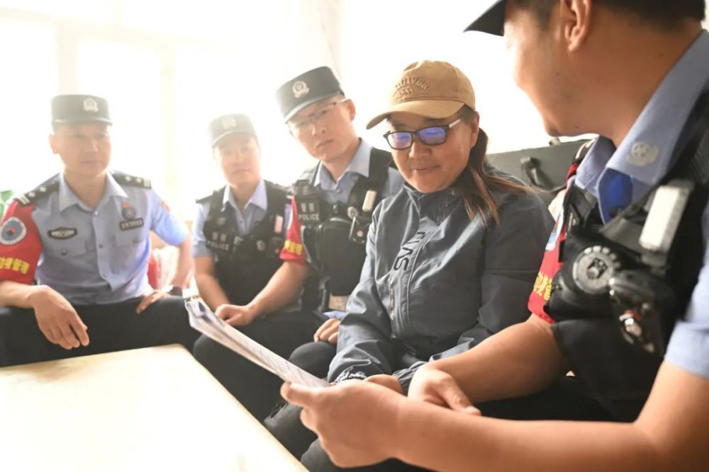 2024年6月22日,四子王旗邊境管理大隊(duì)民警在恩克其其格(右二)家宣講嫦娥六號(hào)返回注意事項(xiàng)。2003年10月16日,神舟五號(hào)飛船返回艙著陸在恩克其其格家的草場(chǎng)上。新華社記者 連振 攝