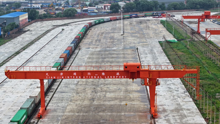 7月1日在天津國際陸港拍攝的準(zhǔn)備發(fā)車的中歐班列(無人機(jī)照片)。新華社記者李然攝