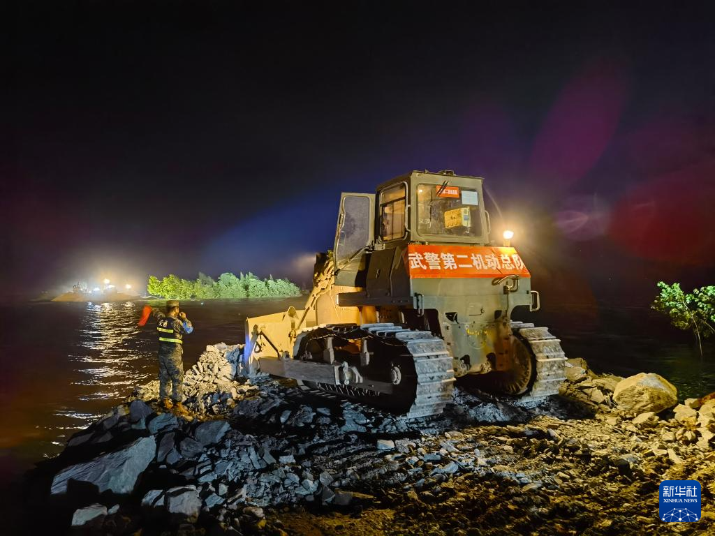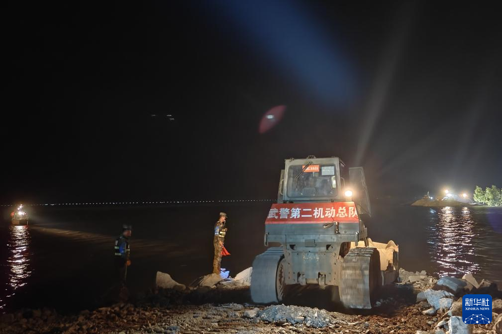 7月7日凌晨,在湖南省岳陽(yáng)市華容縣團(tuán)洲垸洞庭湖一線堤防決口處,武警部隊(duì)官兵出動(dòng)照明車(chē)為施工現(xiàn)場(chǎng)提供照明。新華社記者 李秉宣 攝