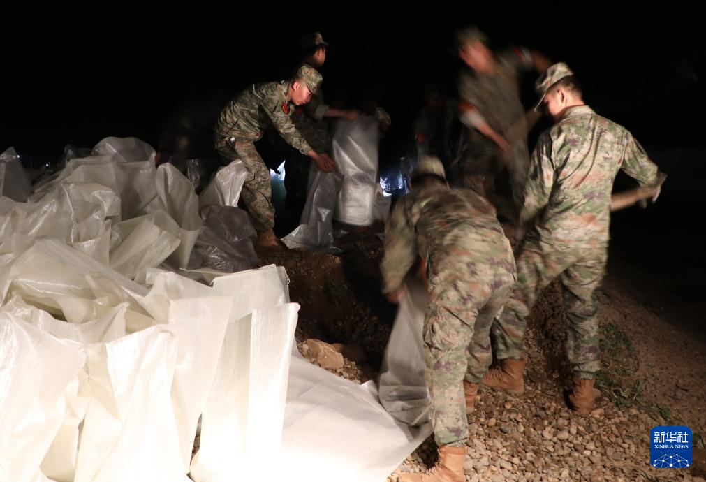 目光可及之處,平江縣民兵應(yīng)急連的60名民兵在連夜裝填沙袋以防不測(cè)。照明設(shè)備不夠,一輛搶險(xiǎn)車(chē)輛打開(kāi)車(chē)燈來(lái)幫忙。車(chē)燈光影下,民兵突擊隊(duì)員們喊起了號(hào)子:“華容加油!平江加油!”