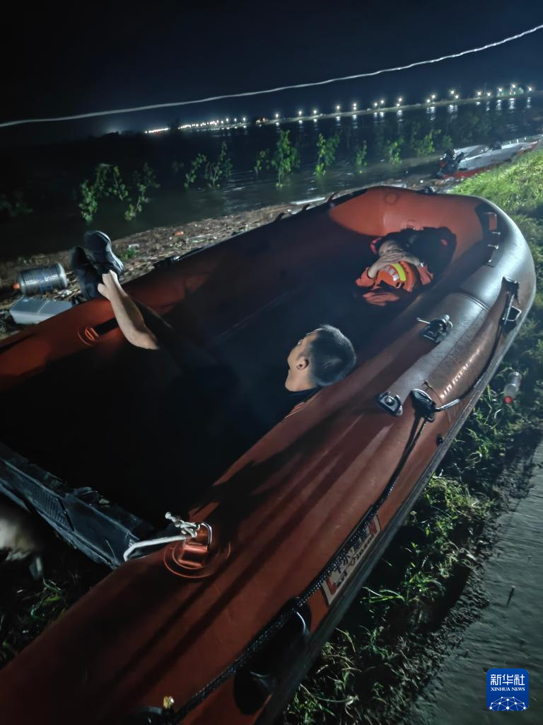 7月7日凌晨,在湖南省岳陽(yáng)市華容縣團(tuán)洲垸洞庭湖一線堤防決口處,隨時(shí)待命的搶險(xiǎn)救援人員在橡皮艇里小憩。新華社記者 黎云 攝