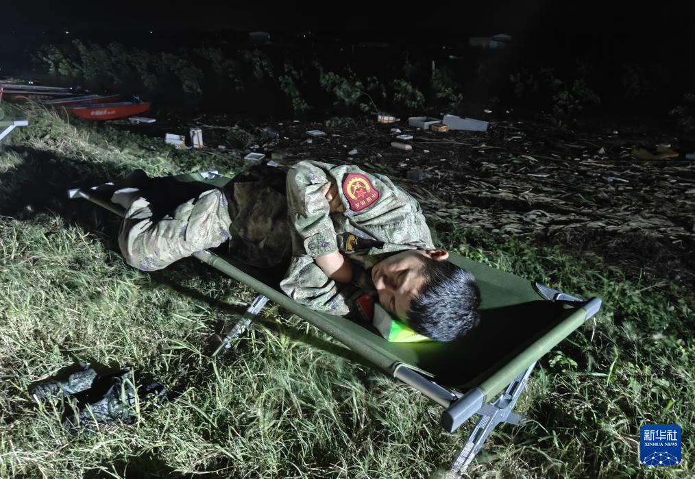 7月7日凌晨,在湖南省岳陽(yáng)市華容縣團(tuán)洲垸洞庭湖一線堤防決口處,隨時(shí)待命的民兵突擊隊(duì)員合衣小憩。新華社記者 黎云 攝