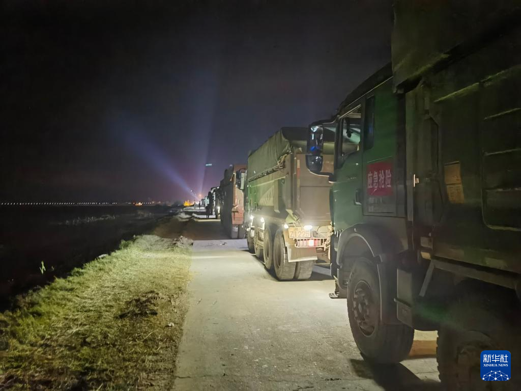 時(shí)間指向凌晨4點(diǎn),通向決口的公路上,滿載石料的卡車(chē)、工程車(chē)輛仍然排著“長(zhǎng)龍”,蜿蜒3公里長(zhǎng),機(jī)械的轟鳴聲響徹大堤。
