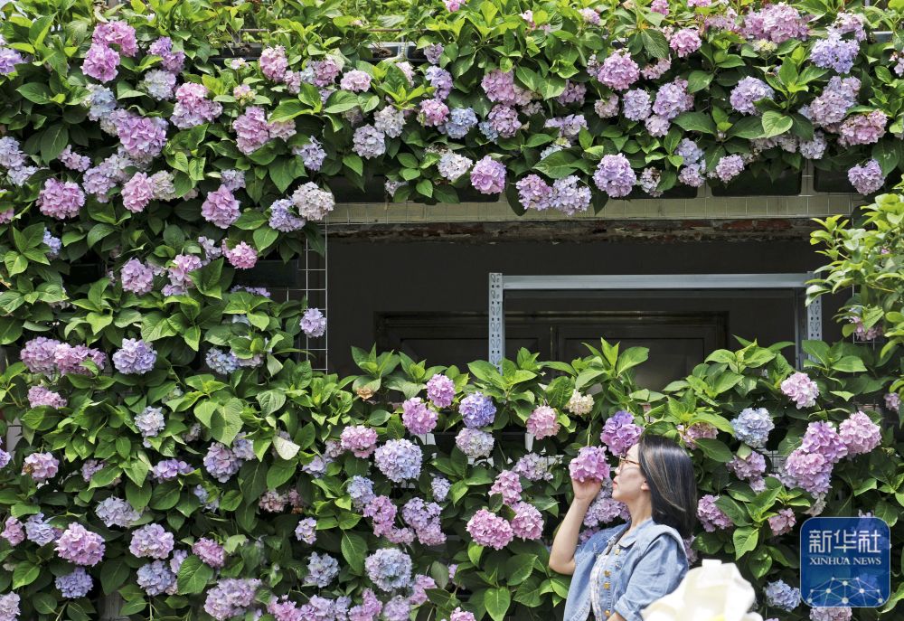 游人在上海東厙村的繡球花墻前拍照(6月4日攝)。新華社記者 劉穎 攝