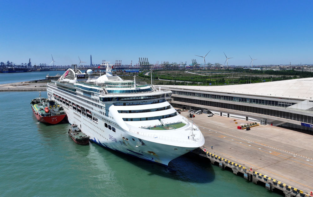 5月15日,“夢想”號(hào)郵輪??吭谔旖驀H郵輪母港(無人機(jī)照片)。新華社記者 趙子碩 攝