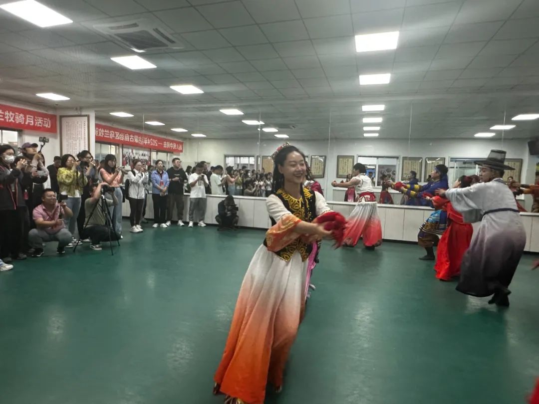 社區(qū)居民在烏蘭牧騎隊(duì)員指導(dǎo)下載歌載舞。