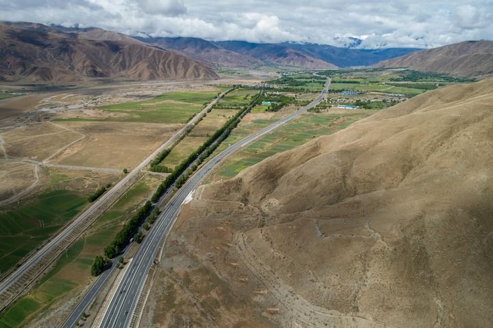 俯瞰西藏拉薩市至日喀則市區(qū)間的交通網(wǎng)絡,從左至右依次為農村公路、鐵路、國道和高等級公路(2024年6月27日攝,無人機照片)。