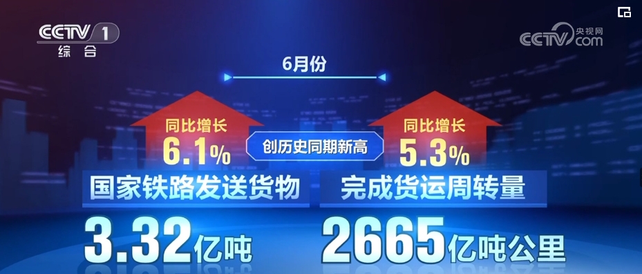 記者7月14日從國鐵集團(tuán)獲悉,6月份,國家鐵路發(fā)送貨物3.32億噸,完成貨運(yùn)周轉(zhuǎn)量2665億噸公里,同比分別增長(zhǎng)6.1%、5.3%,創(chuàng)歷史同期新高。