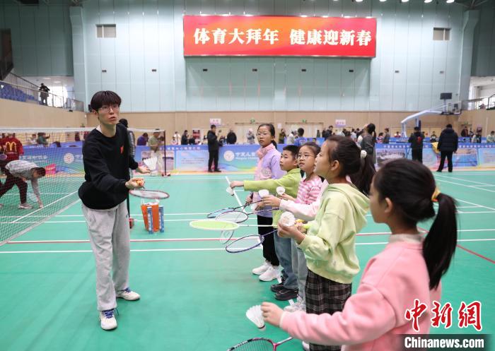 1月18日,2024年寧夏全民健身大拜年暨體育項目推廣普及培訓班在銀川開班,小朋友們跟著教練學習羽毛球顛球。記者 于晶 攝