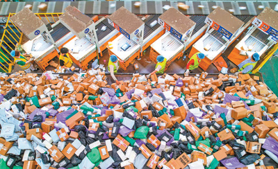 圖為江蘇省宿遷經(jīng)濟技術(shù)開發(fā)區(qū)郵政郵件處理中心,工作人員在進(jìn)行分揀。