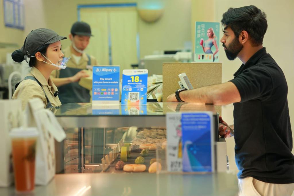 4月8日拍攝的巴基斯坦人冉納在北京藍(lán)色港灣一家飲品店用手機(jī)掃碼支付購買商品。新華社發(fā)