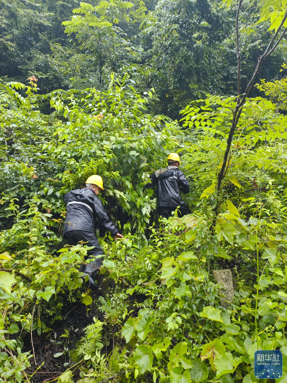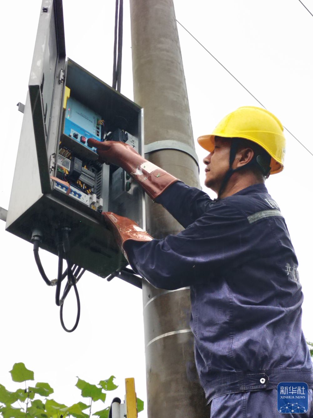 7月27日,在遼寧省丹東市,國家電網(wǎng)丹東供電公司員工對10千伏堡鎮(zhèn)線進(jìn)行檢查?! ⌒氯A社發(fā)