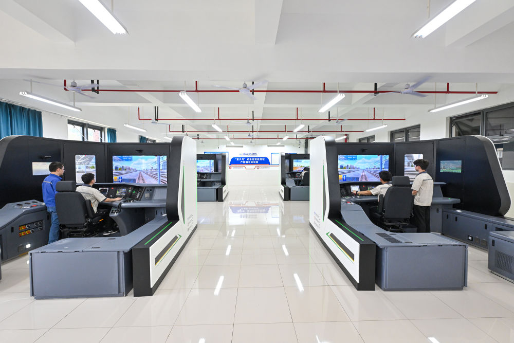 7月26日,湖南鐵道職業(yè)技術(shù)學(xué)院的學(xué)生在產(chǎn)教融合“復(fù)興號”動車組智能駕駛實訓(xùn)室內(nèi)學(xué)習(xí)動車駕駛。 新華社記者 李鑫 攝