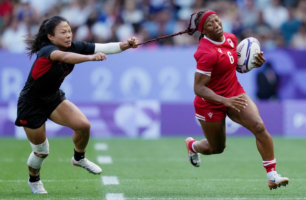 7月29日,中國隊球員劉瀟倩(左)與加拿大隊球員夏麗蒂·威廉姆斯在比賽中。當(dāng)日,在巴黎奧運會七人制橄欖球女子分組循環(huán)賽A組比賽中,中國隊17比26不敵加拿大隊。 新華社記者 呂小煒 攝