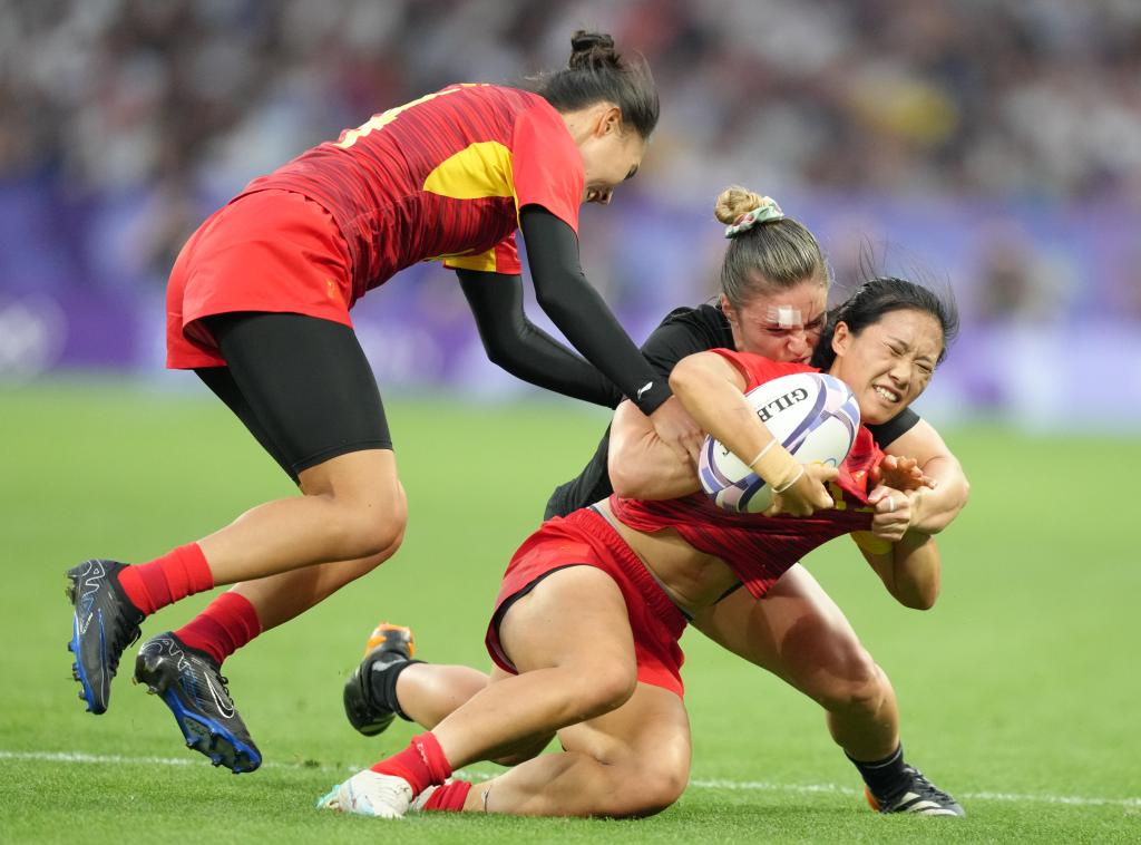 7月29日,中國隊球員胡宇(前)在比賽中。 當(dāng)日,在巴黎奧運會七人制橄欖球女子四分之一決賽中,中國隊5比55不敵新西蘭隊。 新華社記者 呂小煒 攝