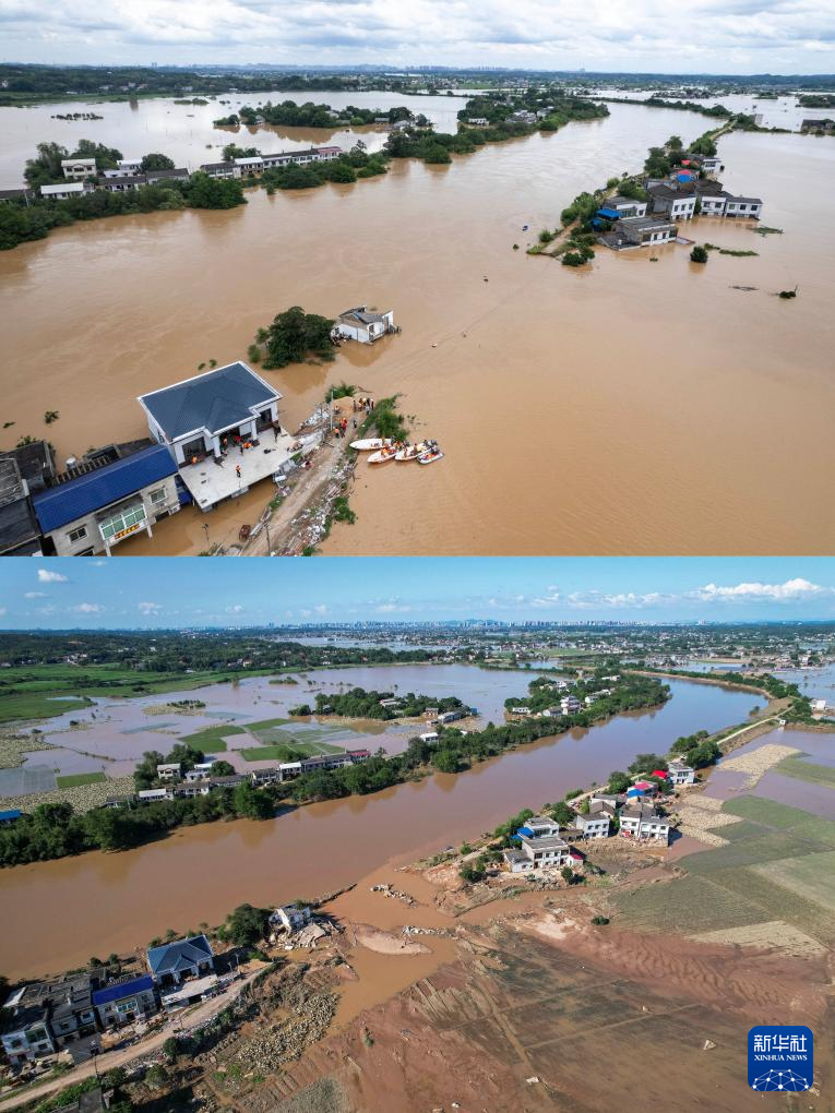 拼版照片:上圖為7月29日12時(shí)拍攝的湖南省湘潭縣易俗河鎮(zhèn)四新堤決口現(xiàn)場(無人機(jī)照片);下圖為7月30日16時(shí)拍攝的湖南省湘潭縣易俗河鎮(zhèn)四新堤決口現(xiàn)場(無人機(jī)照片)。新華社記者 陳思汗 攝