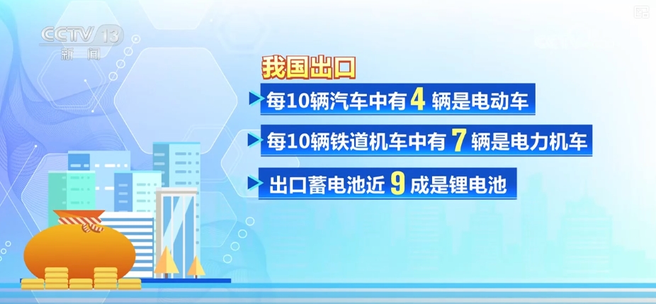 據(jù)海關(guān)統(tǒng)計(jì),我國(guó)出口的每10輛汽車(chē)中有4輛是電動(dòng)車(chē),每10輛鐵道機(jī)車(chē)中有7輛是電力機(jī)車(chē),出口蓄電池近九成是鋰電池,外貿(mào)出口的綠色屬性更強(qiáng)。