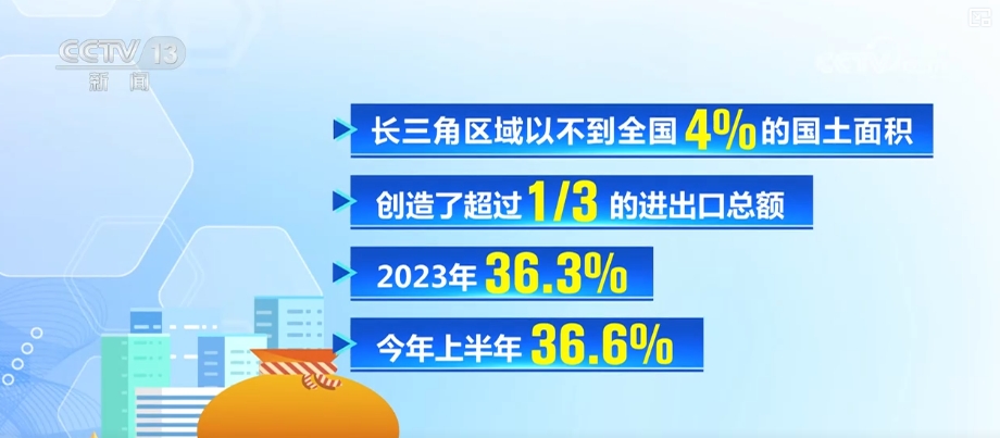長(zhǎng)三角區(qū)域以不到全國(guó)4%的國(guó)土面積,創(chuàng)造了超過(guò)三分之一的進(jìn)出口總額,2023年36.3%,2024年上半年36.6%。