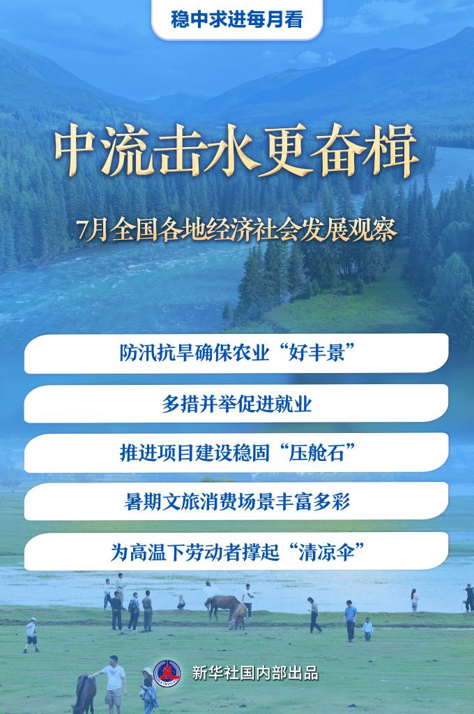 7月是下半年經(jīng)濟(jì)運(yùn)行開局的關(guān)鍵時(shí)段。防汛抗旱應(yīng)對(duì)極端天氣挑戰(zhàn),促就業(yè)推出新舉措,重大項(xiàng)目壓茬推進(jìn)……行至年中,各地凝聚力量,奮楫前進(jìn),不斷增進(jìn)民生福祉,更好地推動(dòng)高質(zhì)量發(fā)展。