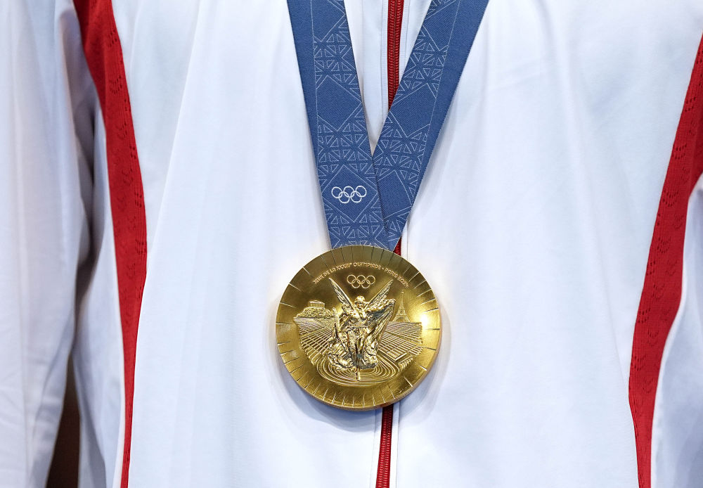 ↑這是7月31日拍攝的中國選手潘展樂獲得的金牌。新華社記者 杜宇 攝