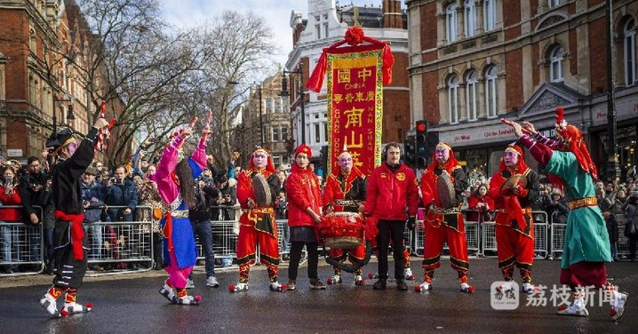 當(dāng)?shù)貢r(shí)間 2024 年 2 月 11 日,陳來(lái)發(fā)教練率領(lǐng)廣東普寧南山英歌隊(duì)的近 20 名舞者現(xiàn)身英國(guó)倫敦,揭開了當(dāng)?shù)匦麓簯c典的帷幕,這也是普寧英歌首次出海。與此同時(shí),千里之外的普寧市內(nèi)另有一支南山英歌隊(duì)伍正穿梭于街巷,為市民驅(qū)邪扶正,帶隊(duì)者之一正是陳揚(yáng)波。