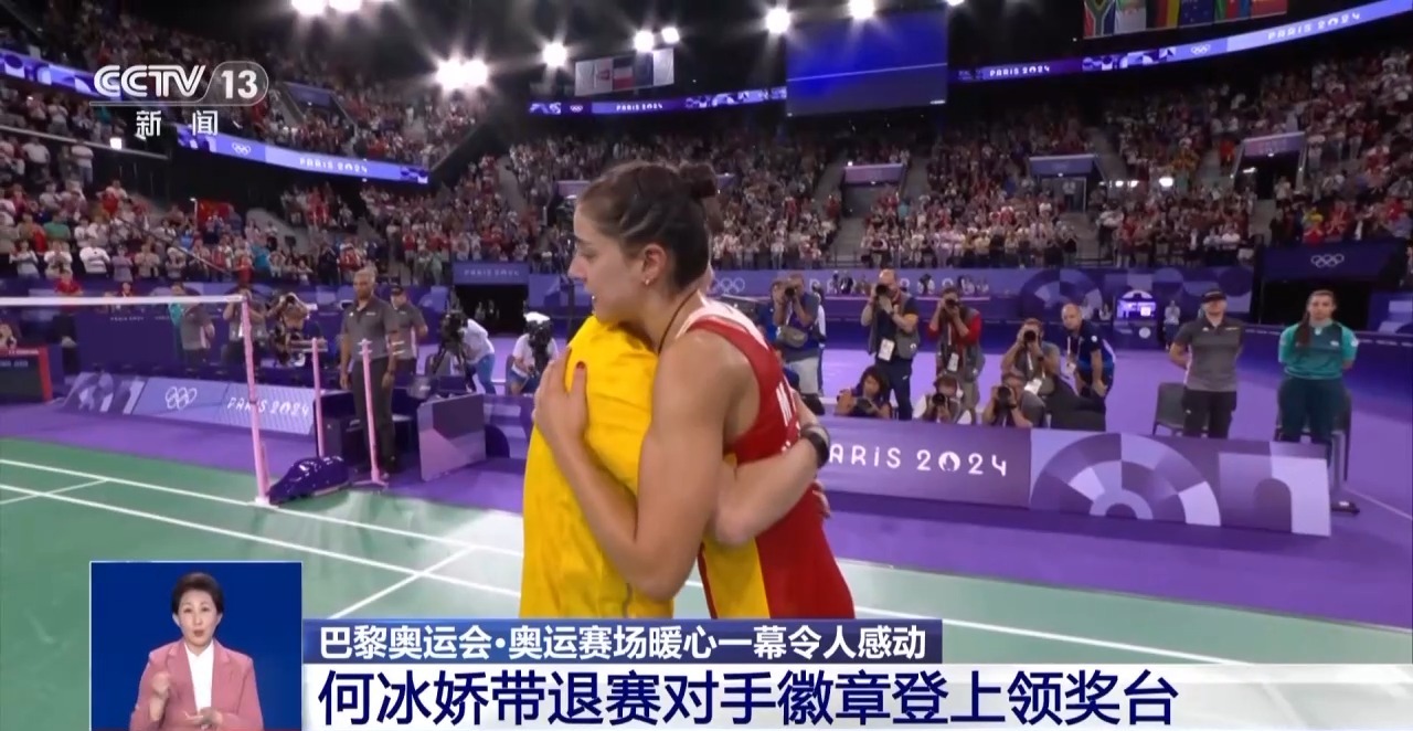 在羽毛球女單決賽中,中國選手何冰嬌0∶2不敵韓國的安洗瑩,收獲一枚銀牌。頒獎儀式上,何冰嬌在舉起獎牌的同時,拿出了一枚帶有西班牙國旗的徽章,向半決賽中因傷退賽的西班牙名將馬林送上慰問,祝愿她能夠早日康復,重回賽場。運動員之間不只有競爭,也有惺惺相惜、互相尊重,這也是奧林匹克精神的一種體現(xiàn)。