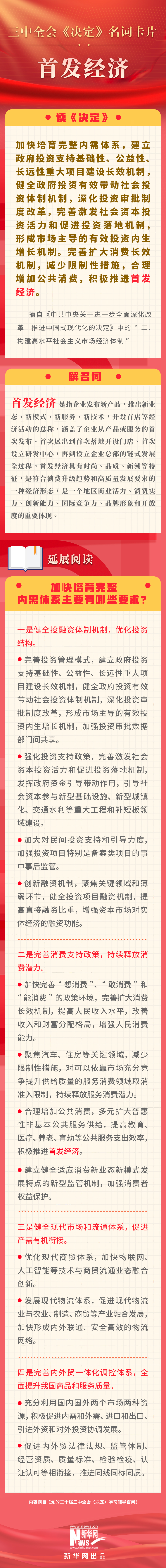 黨的二十屆三中全會審議通過了《中共中央關(guān)于進一步全面深化改革、推進中國式現(xiàn)代化的決定》。新華網(wǎng)依據(jù)《黨的二十屆三中全會〈決定〉學習輔導百問》,制作三中全會《決定》系列名詞卡片,和大家一起來深入學習領(lǐng)會二十屆三中全會精神。本期名詞是“首發(fā)經(jīng)濟”。