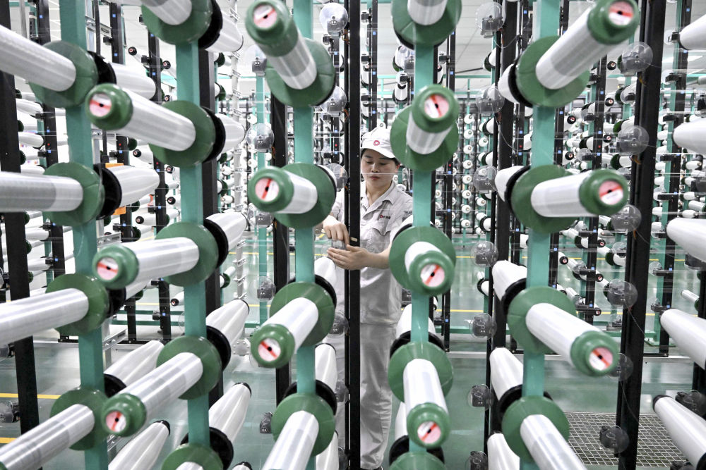 在位于河南安陽林州市的河南光遠新材料股份有限公司電子布準備車間,工作人員在檢查整經(jīng)機機臺(2024年2月22日攝)。該公司通過自主技術(shù)創(chuàng)新,攻克“卡脖子”技術(shù),研發(fā)出5G用低介電電子紗、5G用超薄電子布等產(chǎn)品。新華社記者 李安 攝