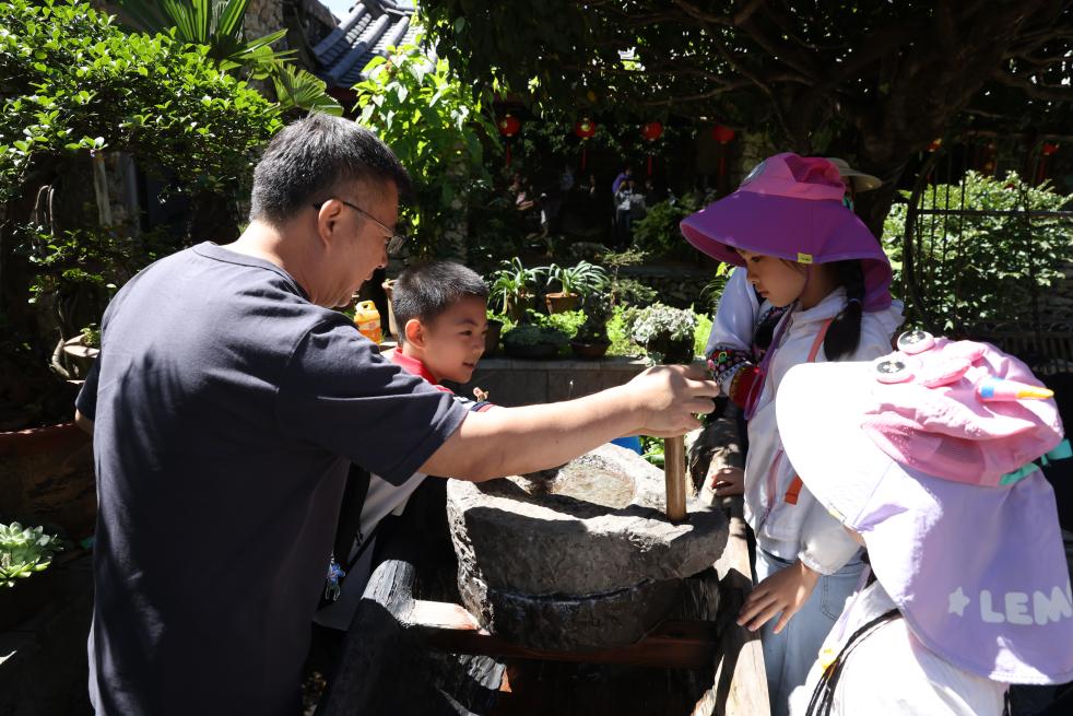 7月31日,游客在麗江市玉龍納西族自治縣玉湖村的一處納西族村民家中體驗當(dāng)?shù)靥厣幕?。新華社記者 呂帥 攝