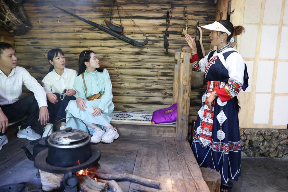 7月31日,廣西游客藍(lán)夢婷一家在麗江市玉龍納西族自治縣玉湖村的一處納西族村民家中體驗當(dāng)?shù)靥厣幕?。新華社記者 呂帥 攝