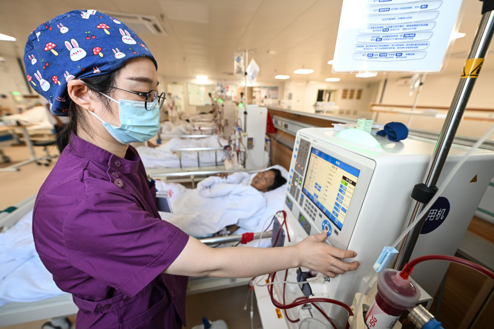 江蘇海安市曲塘中心衛(wèi)生院護(hù)士在血液透析中心操作設(shè)備(2024年7月31日攝)。海安加快優(yōu)質(zhì)醫(yī)療資源下沉,對(duì)基層醫(yī)療機(jī)構(gòu)管理、技術(shù)等方面進(jìn)行幫扶。數(shù)據(jù)顯示,2023年海安市縣域內(nèi)就診率為90.54%,基層醫(yī)療衛(wèi)生機(jī)構(gòu)門急診占比為74.86%。新華社記者 季春鵬 攝
