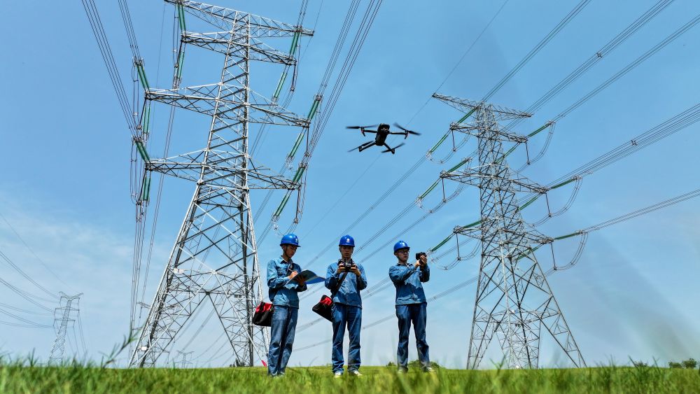 面對(duì)安徽、江蘇持續(xù)高溫,皖蘇兩省的電力工人聯(lián)合對(duì)省際聯(lián)絡(luò)線及相關(guān)配電設(shè)施進(jìn)行檢修,并開展輸變電設(shè)施巡視檢查。這是在安徽省滁州市南譙區(qū),電力工人運(yùn)用無人機(jī)對(duì)500千伏輸電線路進(jìn)行巡視檢查(2024年8月9日攝)。新華社記者 曹力 攝