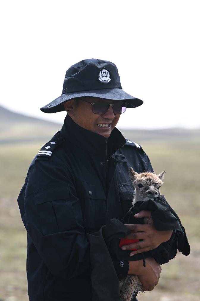 這時(shí),可可西里森林公安局輔警尼瑪扎西接過了多結(jié)仁欠懷里的小藏羚羊。小藏羚羊渾身濕漉漉的,不停地發(fā)抖。尼瑪扎西隨即脫下自己的衣服,一邊給小藏羚羊擦身體,一邊溫柔地說:“你的媽媽找不到了,我們來當(dāng)你的媽媽?!?/p>