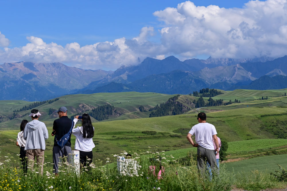7月10日,在新疆昌吉回族自治州奇臺(tái)縣江布拉克景區(qū),游客在拍攝萬畝小麥旱田景觀。新華社記者 丁磊 攝