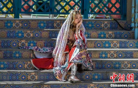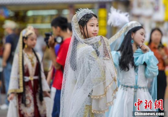 8月12日,新疆烏魯木齊市大巴扎步行街,游客穿著經(jīng)過(guò)改進(jìn)的民族服飾拍攝高清寫(xiě)真照。