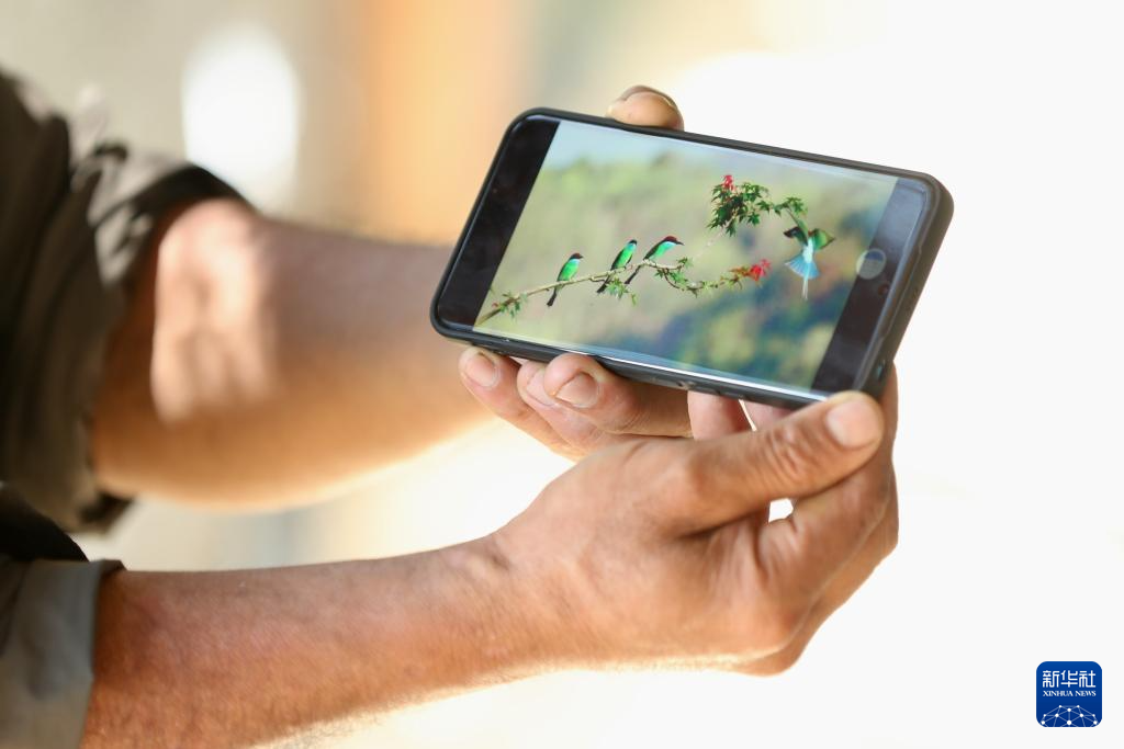 8月12日,福建南平市延平區(qū)爐下鎮(zhèn)斜溪村村民王崇年展示手機里攝影愛好者發(fā)來的藍(lán)喉蜂虎照片。 新華社記者 姜克紅 攝