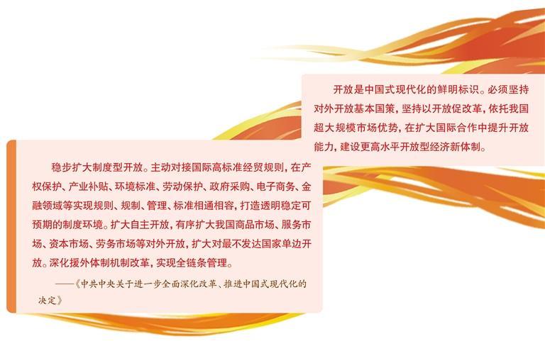 《決定》提出“穩(wěn)步擴大制度型開放”,要求主動對接國際高標準經(jīng)貿(mào)規(guī)則。《決定》作出的一系列重要部署影響廣泛、意義深遠。