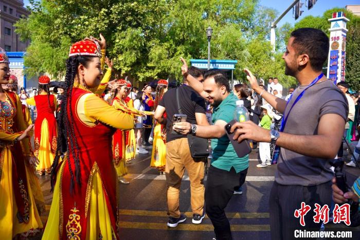 伊犁哈薩克自治州是多民族聚居區(qū),擁有47個(gè)不同民族。僅在伊寧市喀贊其民族風(fēng)情街,就居住著維吾爾族、哈薩克族、回族等13個(gè)不同民族的民眾。當(dāng)日,巴基斯坦媒體和智庫(kù)人士來(lái)到喀贊其街道,他們?cè)诮诌呌^看民族舞蹈表演,還邂逅了一場(chǎng)維吾爾族婚禮。