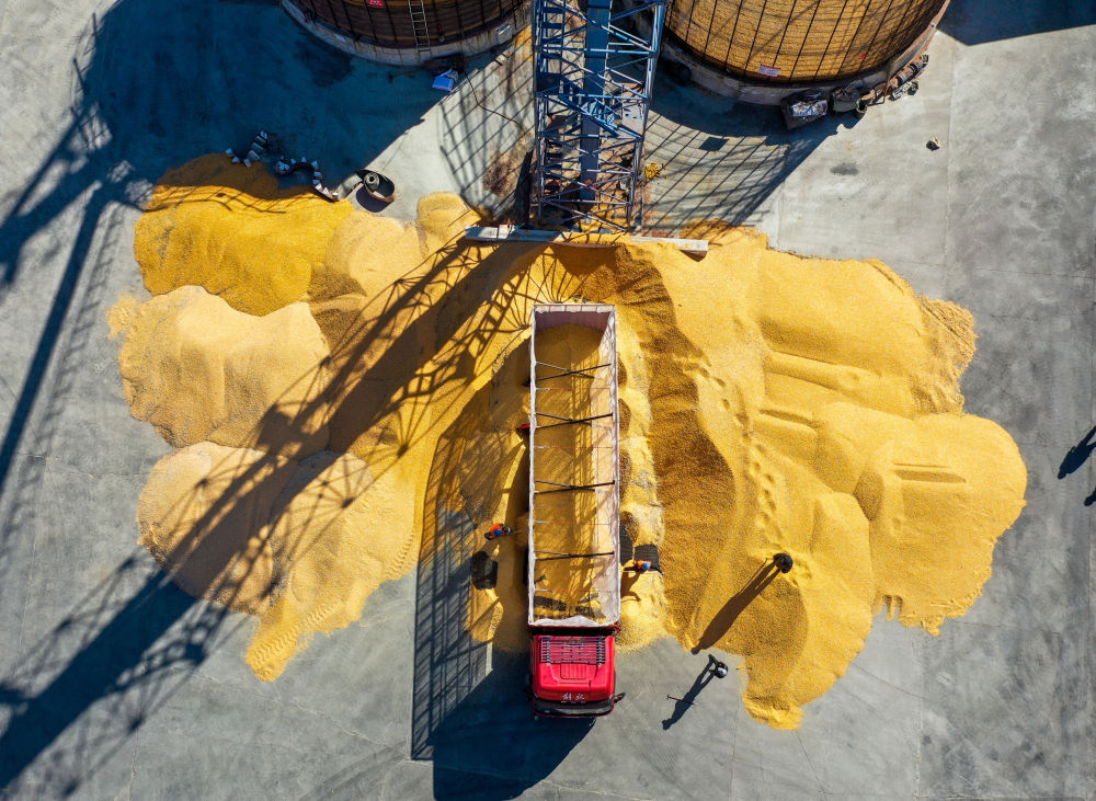 2023年10月15日,司機(jī)駕駛運(yùn)糧車在內(nèi)蒙古通遼市科爾沁左翼中旗腰林毛都鎮(zhèn)收糧站卸糧(無(wú)人機(jī)照片)。