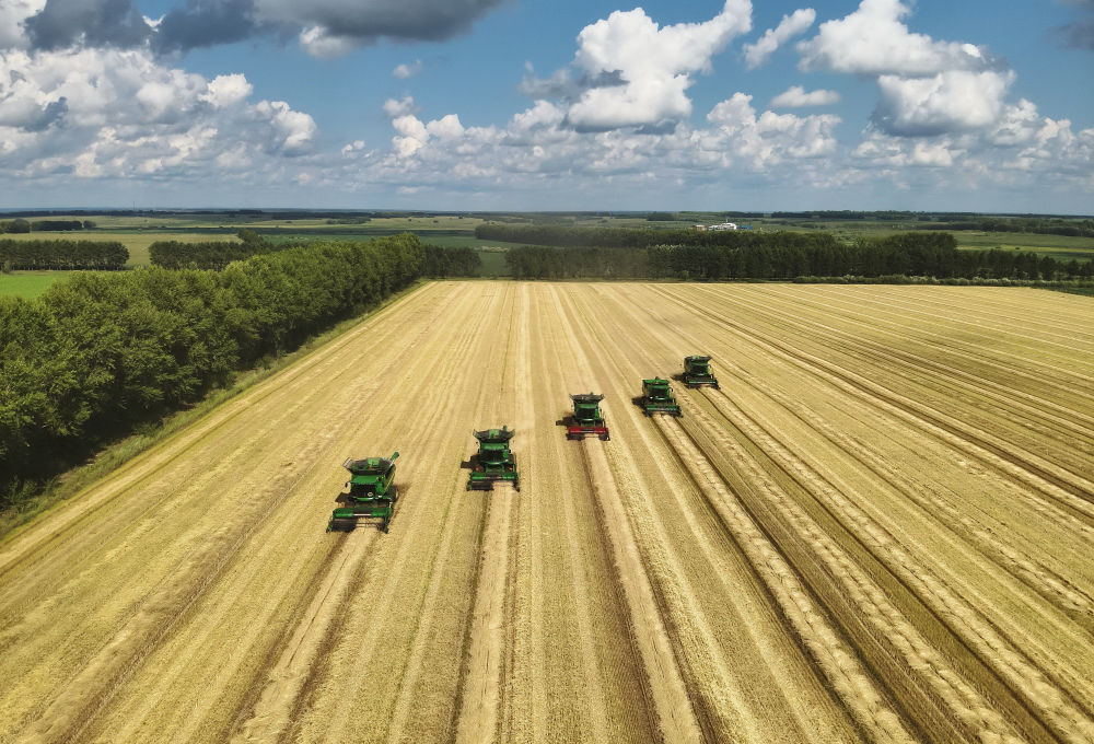 2024年8月9日,農(nóng)機(jī)在北大荒集團(tuán)黑龍江紅星農(nóng)場(chǎng)有限公司田間收獲小麥(無(wú)人機(jī)照片)。截至2023年,北大荒集團(tuán)農(nóng)業(yè)科技進(jìn)步貢獻(xiàn)率達(dá)到77.07%,農(nóng)業(yè)綜合機(jī)械化率達(dá)到99.7%。