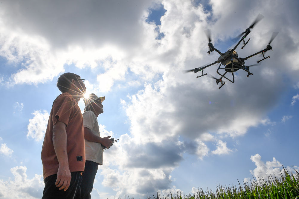 2024年8月8日,在吉林省梨樹(shù)縣孤家子鎮(zhèn),當(dāng)?shù)剞r(nóng)業(yè)發(fā)展服務(wù)站高級(jí)農(nóng)藝師蘭雨壯(左)查看無(wú)人機(jī)作業(yè)情況。